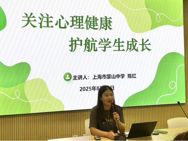 8月13日下午,在金水湖实验中学的报告厅内,上海市蒙山中学心理中心负责人陈红老师以《关注心理健康 护航学生成长》为题,为全体班主任带来了一场兼具专业深度与实践温度的心理健康教育专题讲座。陈老师通过真实案例剖析、互动情景模拟等生动形式,系统讲解了青少年心理危机的识别技巧与干预策略,为一线教育工作者提供了切实可行的"心理育人"工具箱,助力班主任真正做到"传道授业"与"心灵培育"的和谐统一。